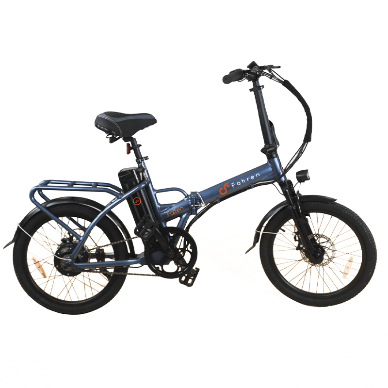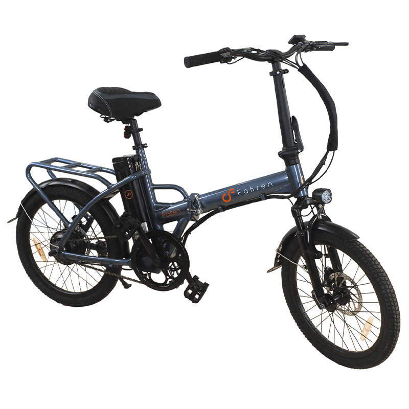 Bicicleta plegable urbana de 250 watts de motor, batería de 10ah y una autonomía de hasta 60 km, frenos mecánicos, luz delantera, display digital, y parrilla incorporada
